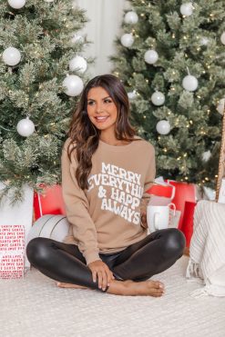 Best Sale ๐ Pink Lily Merry Everything And Happy Always Light Tan Graphic Sweatshirt ๐