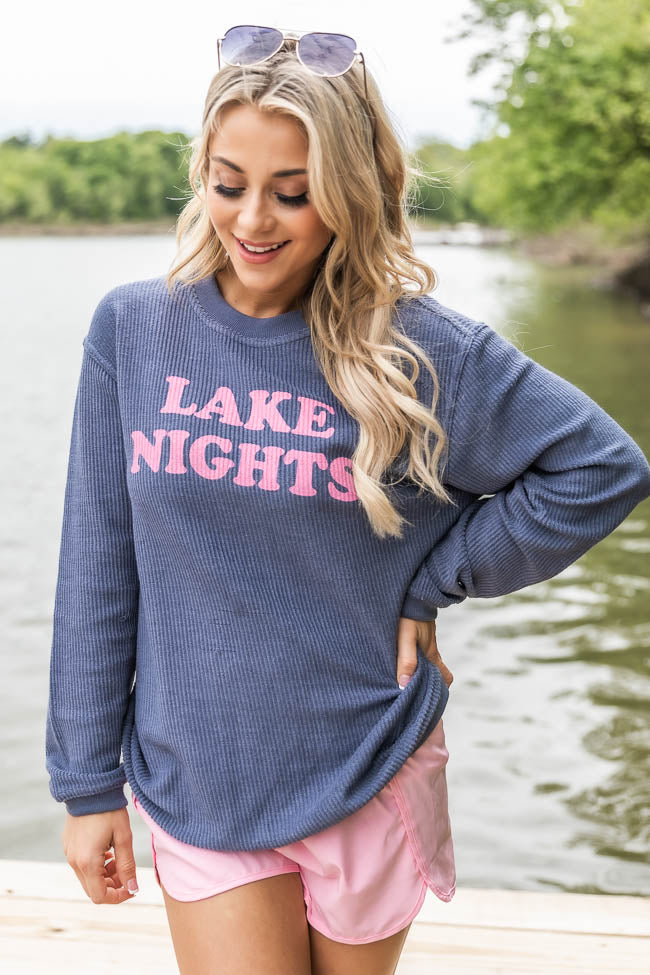 This sassy lake night graphic sweatshirt is made for relaxing weekend days! You can’t go wrong with a classic navy corded sweatshirt paired with a cute pink design -We love the lightweight and soft material – it’s so easy to wear all day long!