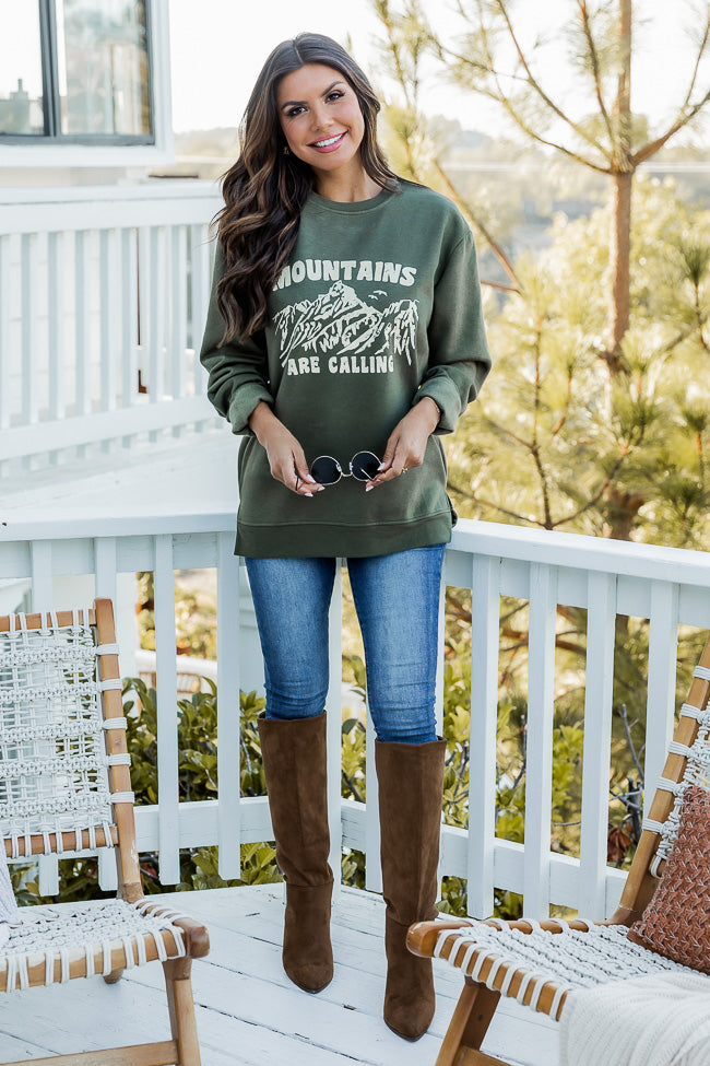 - Mountains are callingΒ olive graphic sweatshirt