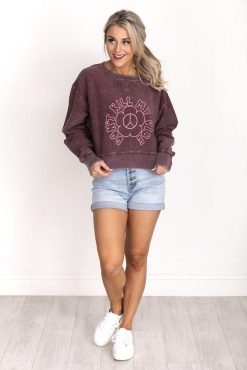 Cheapest ๐ Pink Lily Don’t Kill My Vibe Cropped Corded Maroon Graphic Sweatshirt ๐